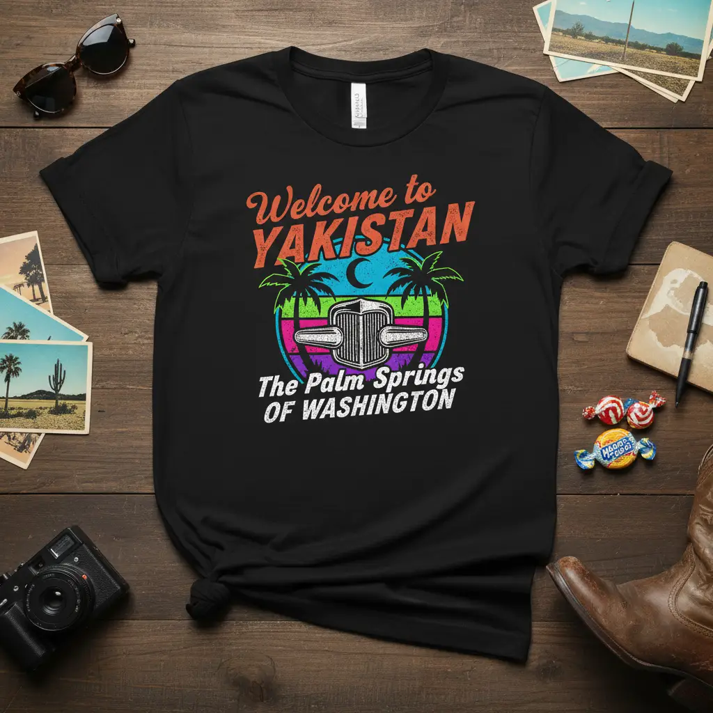 This exclusive “Welcome to Yakistan The Palm Springs of Washington” tee is designed to stand out. It features a classic retro car set against a backdrop of palm trees and a colorful, striped sunset. The slogan itself is a playful nod to the area’s nickname, offering a unique piece of wearable art that sparks conversation and connection.