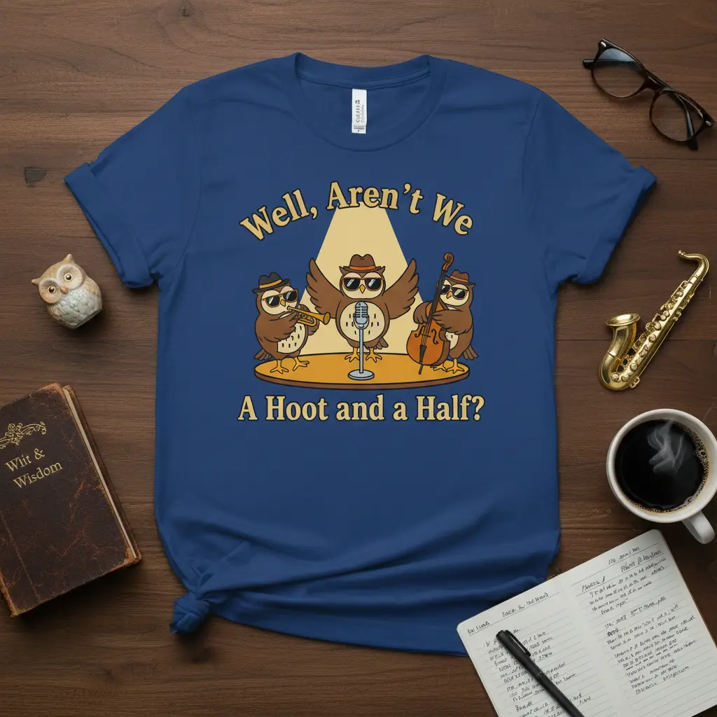 This t-shirt showcases a fantastic graphic of three owls forming a band, complete with instruments and a microphone. The top of the design proudly displays the phrase “Well, Aren’t We” in a stylish, curved font, while the bottom features “A Hoot and a Half?” in a complementary style. The owls themselves are depicted with cool sunglasses and hats, adding to their charismatic performance.