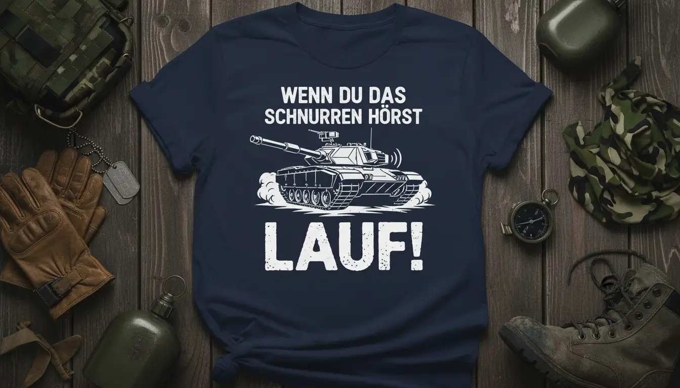 This WENN DU DAS SCHNURREN HÖRST LAUF! design taps into the fascination with military hardware, specifically tanks, which represent strength and power. The playful contrast between the “purring” sound of a tank and the command to “RUN!” adds a layer of ironic humor that resonates with many. It’s more than just a shirt; it’s a piece of wearable art that sparks interest and often leads to shared laughs.