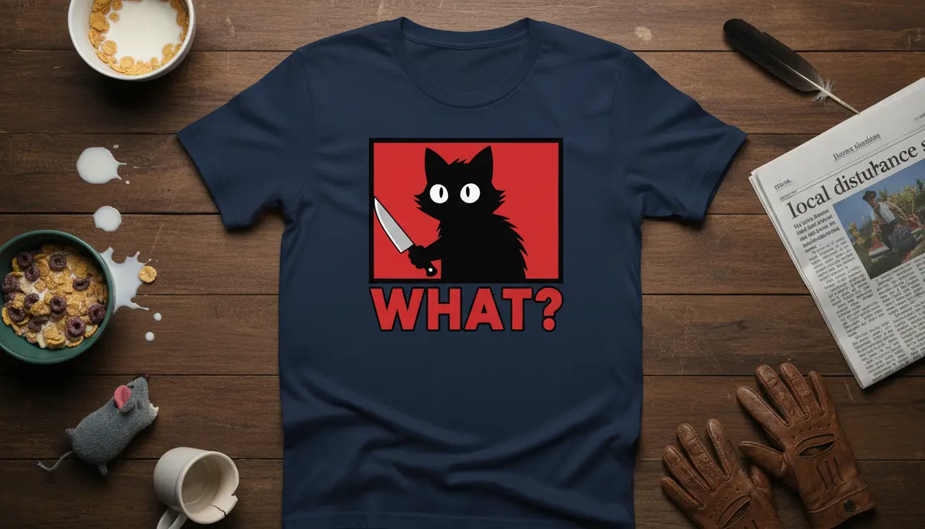 This eye-catching t-shirt features a black cat looking directly at you with wide, bewildered eyes, clutching a shiny knife. Below the startling image, the word “WHAT?” is emblazoned in bold, red letters. The design is a perfect embodiment of the internet’s love for memes and the often-unpredictable nature of cats. It’s ideal for anyone who loves to express their personality through their clothing, especially those who enjoy a touch of dark humor or find feline antics endlessly amusing.