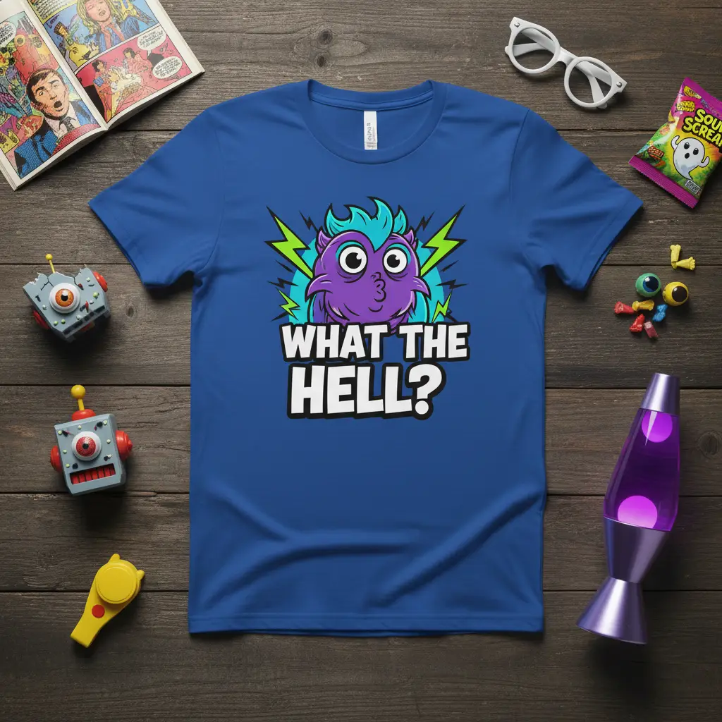 WHAT THE HELL? This t-shirt is designed to capture attention and spark conversation with its bold statement and quirky graphic. It’s perfect for anyone who enjoys a good laugh and isn’t afraid to express their surprise or bewilderment in a fun, stylish way. The unique design combines a humorous quote with an endearing, yet slightly bewildered, cartoon monster. This apparel is ideal for casual outings, parties, or just lounging around, offering both comfort and a unique personality statement.