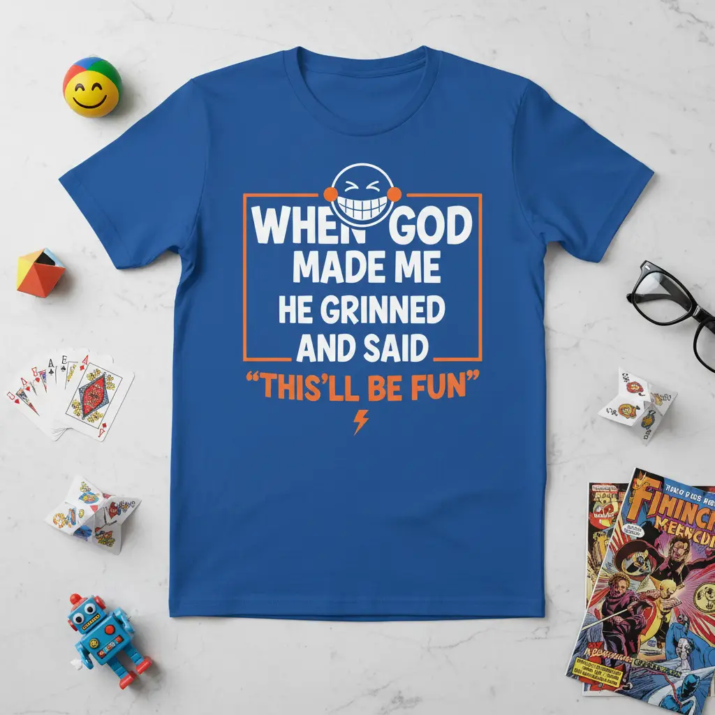 When God Made Me He Grinned And Said “This’ll Be Fun”, this t-shirt is more than just apparel; it’s a declaration of your spirited and humorous approach to life. This eye-catching design encapsulates a sense of playful confidence and a readiness for whatever adventures come your way. It’s perfect for anyone who enjoys a good laugh and isn’t afraid to show off their unique personality. The bold typography and the witty quote make it a standout piece that’s sure to turn heads and spark conversations. Wear it proudly and let the world know you’re here for the fun.