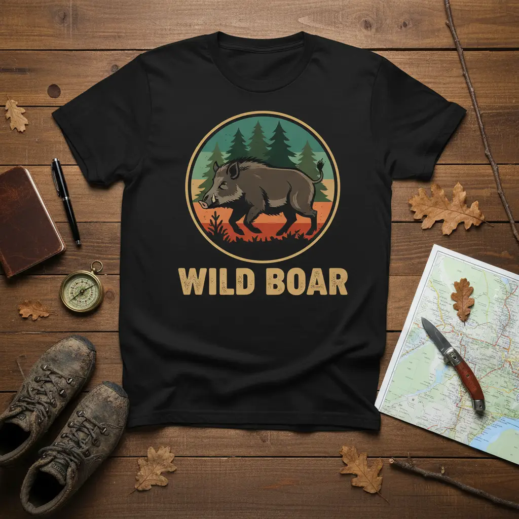 This t-shirt features a captivating illustration of a wild boar, rendered in a distinct vintage retro style. The graphic is framed within a circular motif, complete with silhouetted pine trees and a warm, sunset-inspired color palette. This design speaks to the adventurer in all of us, celebrating the raw beauty and untamed spirit of the wild boar. It’s a piece that resonates with anyone who feels drawn to the natural world and its incredible inhabitants.