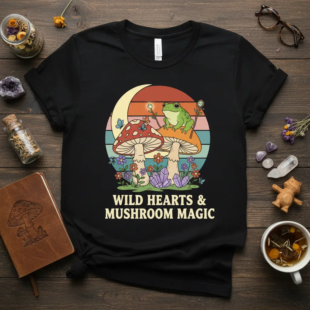 WILD HEARTS & MUSHROOM MAGIC comes to life on this captivating t-shirt, inviting you into a world of enchantment and natural wonder. This unique design blends whimsical elements with a touch of bohemian charm, perfect for those who feel a deep connection to the mystical side of nature. It’s more than just apparel; it’s a statement piece that celebrates the magic found in every rustling leaf and hidden grove. Embrace your inner wild heart and let the mushroom magic inspire your day.