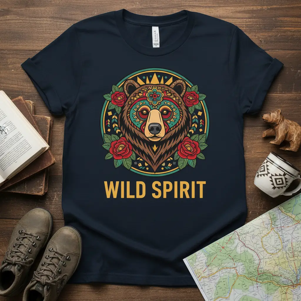 This eye-catching t-shirt features the powerful declaration “WILD SPIRIT” emblazoned below a stunning graphic of a bear’s face. The bear is intricately detailed, set within a vibrant mandala-like circle adorned with traditional patterns and lush red roses. This design speaks to the untamed, adventurous, and free-spirited individual who finds solace and inspiration in nature’s embrace. It’s a wearable piece of art that resonates with those who seek connection to the natural world and express their inner essence through their style.