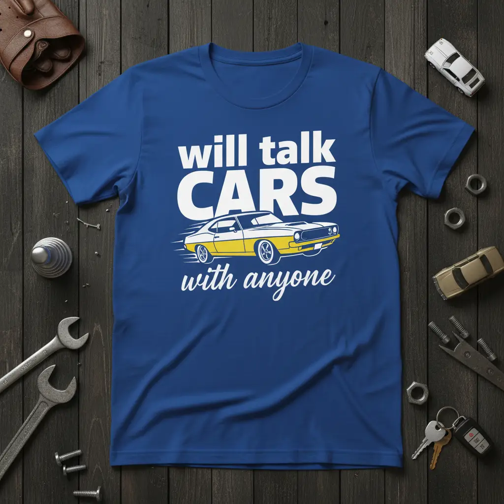 Will talk CARS with anyone, and this t-shirt is the perfect way to express that passion. Designed for the true automotive enthusiast, it boldly declares your love for all things cars. The striking graphic features a sleek retro car, symbolizing a shared appreciation for classic and modern vehicles alike. It’s more than just apparel; it’s a conversation starter for anyone who understands the thrill of the open road and the beauty of a well-engineered machine. This tee is crafted for comfort and durability, ensuring you can wear your automotive pride everywhere you go.