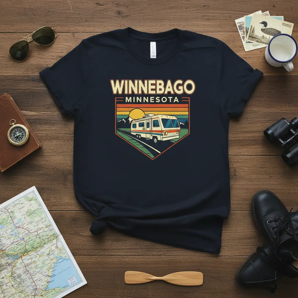 The “Winnebago Minnesota” text is prominently displayed in a classic font, setting the tone for a journey back in time. This design isn’t just apparel; it’s a statement of your adventurous lifestyle and your appreciation for the great outdoors. Whether you’re a seasoned RVer or dreaming of your first road trip, this shirt connects you to a community of like-minded explorers.