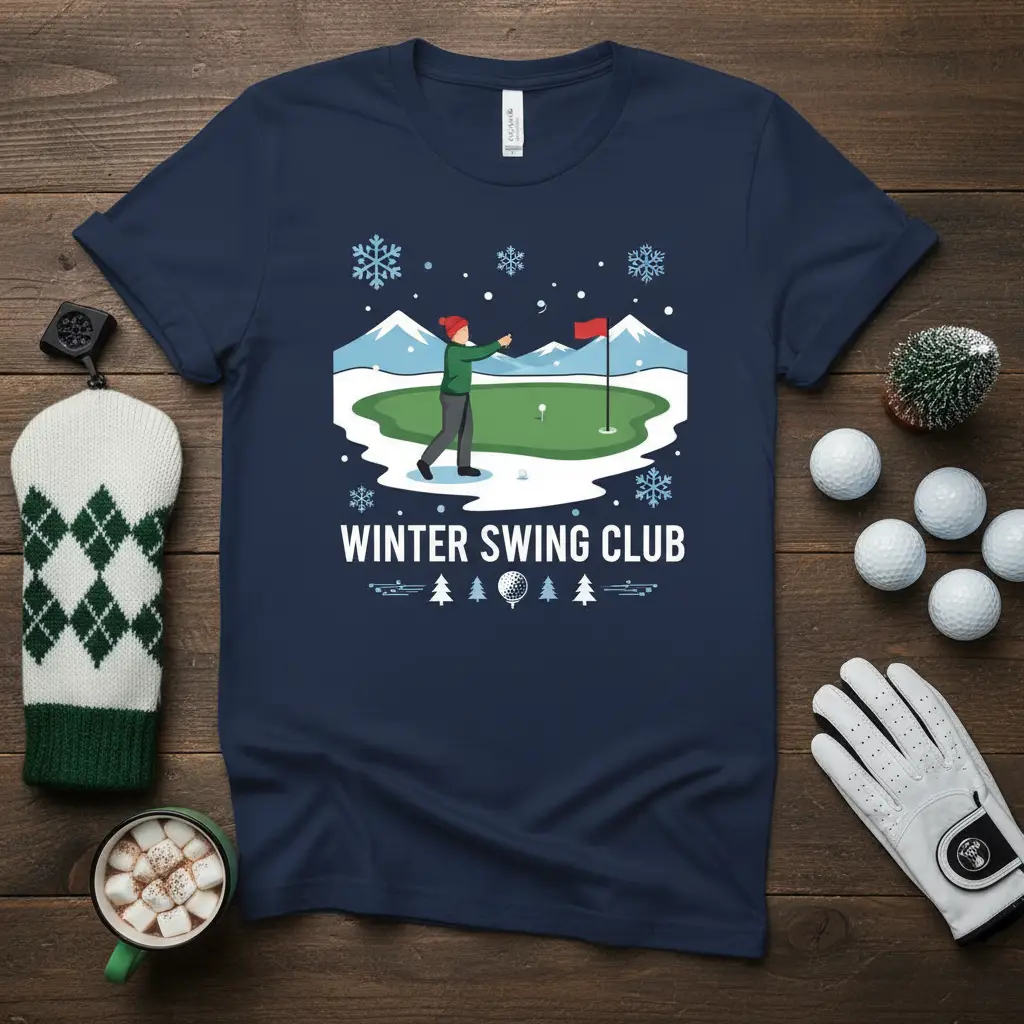 The “Winter Swing Club” graphic design is a playful nod to golfers who brave the cold to hit the links. It features a charming illustration of a golfer in action against a backdrop of snow-capped mountains and falling snowflakes. This design isn’t just visually appealing; it speaks to the dedication and passion of golfers who find joy in every swing, regardless of the weather.