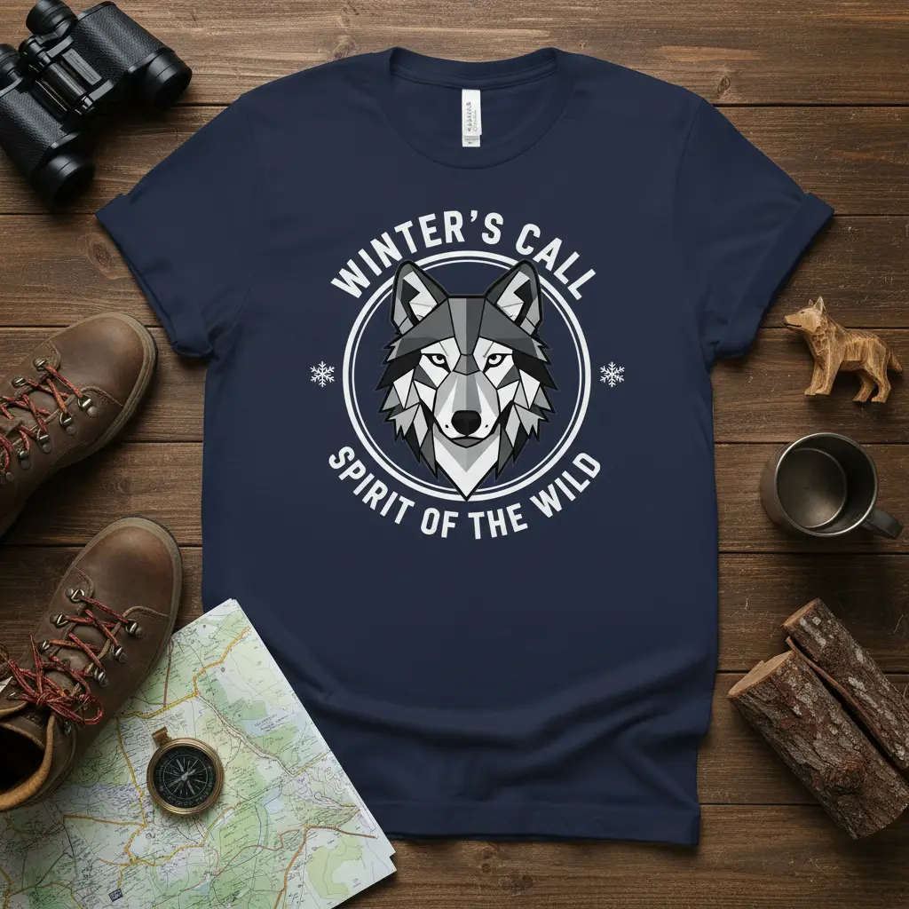 This striking design features a captivating geometric wolf, a symbol of resilience and untamed freedom. The phrase “WINTER’S CALL SPIRIT OF THE WILD” is artfully integrated, creating a powerful visual narrative for those who feel a deep connection to nature. It speaks to the adventurous spirit that thrives in the crisp air of winter and the serene beauty of untouched landscapes.