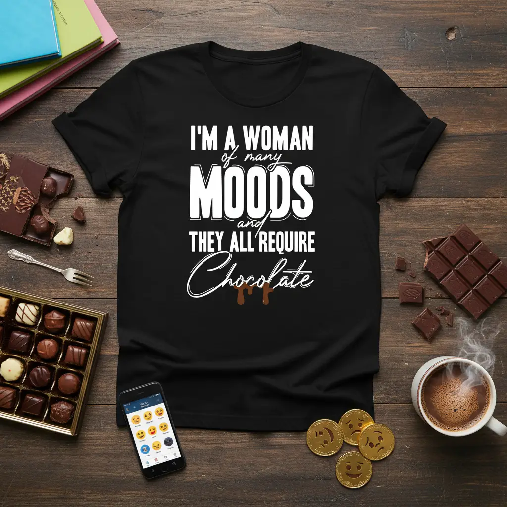 This captivating t-shirt proudly displays the full quote “I’M A WOMAN of many MOODS and THEY ALL REQUIRE Chocolate,” making it an instant favorite for anyone who understands the power of a good chocolate bar. The design uses crisp white typography for maximum impact against the dark fabric, ensuring the message is clear and stylish. The playful script for “Chocolate” with its melting effect adds a touch of delicious artistry.