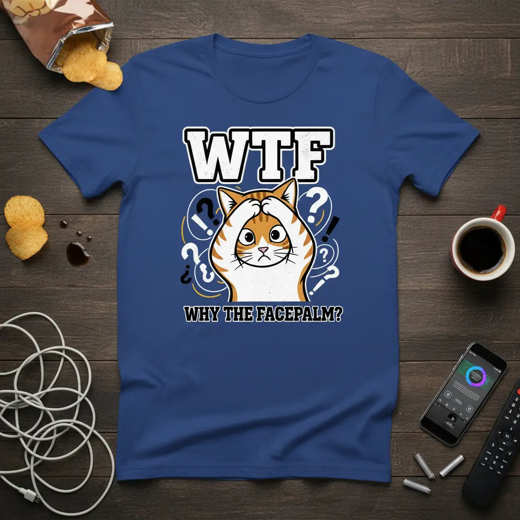 The “WTF Why The Facepalm?” design is a masterclass in expressing relatable humor through simple yet impactful graphics. The distressed orange tabby cat, with its paws pressed firmly against its forehead, is an iconic image of exasperation. This visual, combined with the bold text, creates a powerful statement that resonates with anyone who has ever felt overwhelmed or utterly confused by a situation. It’s a fantastic conversation starter and a clear indicator of your sense of humor.