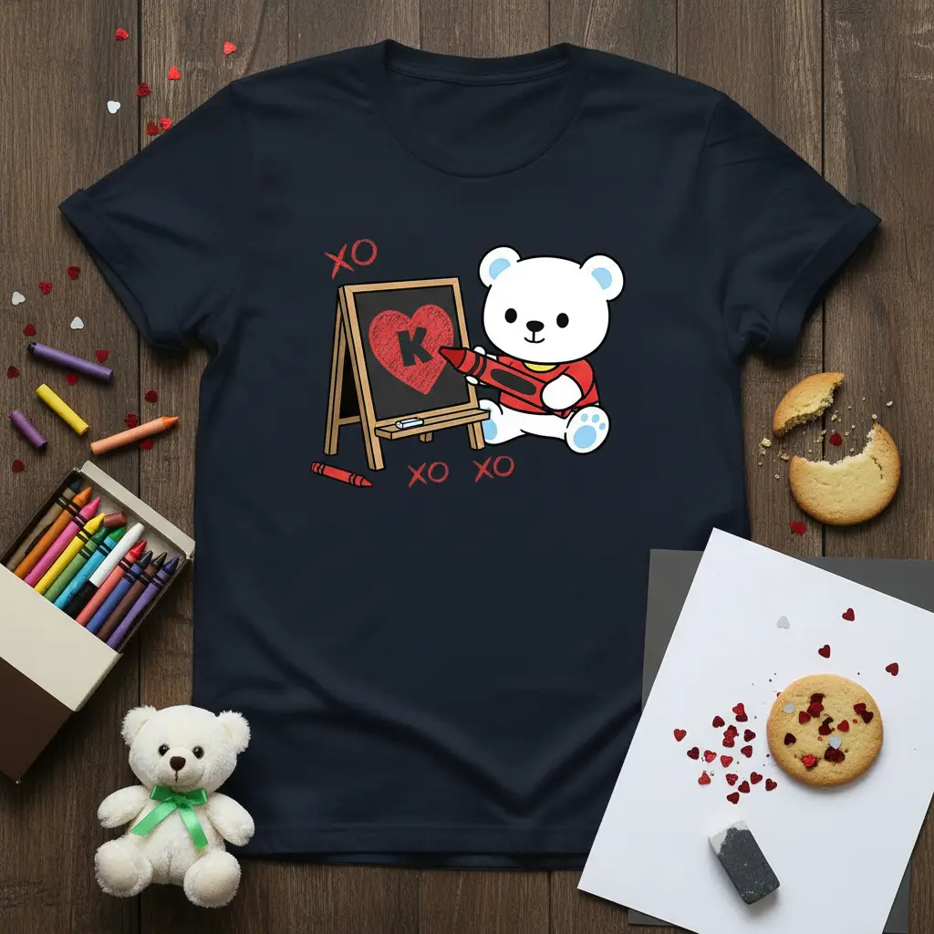 This charming graphic tee showcases an endearing white bear, artistically drawing the letter ‘K’ within a large heart on a blackboard. The surrounding “XO” symbols add a touch of playful affection, making this design a perfect representation of love and sweet sentiments. It’s an ideal choice for expressing your feelings on Valentine’s Day or any day you want to share a little extra warmth and kindness.