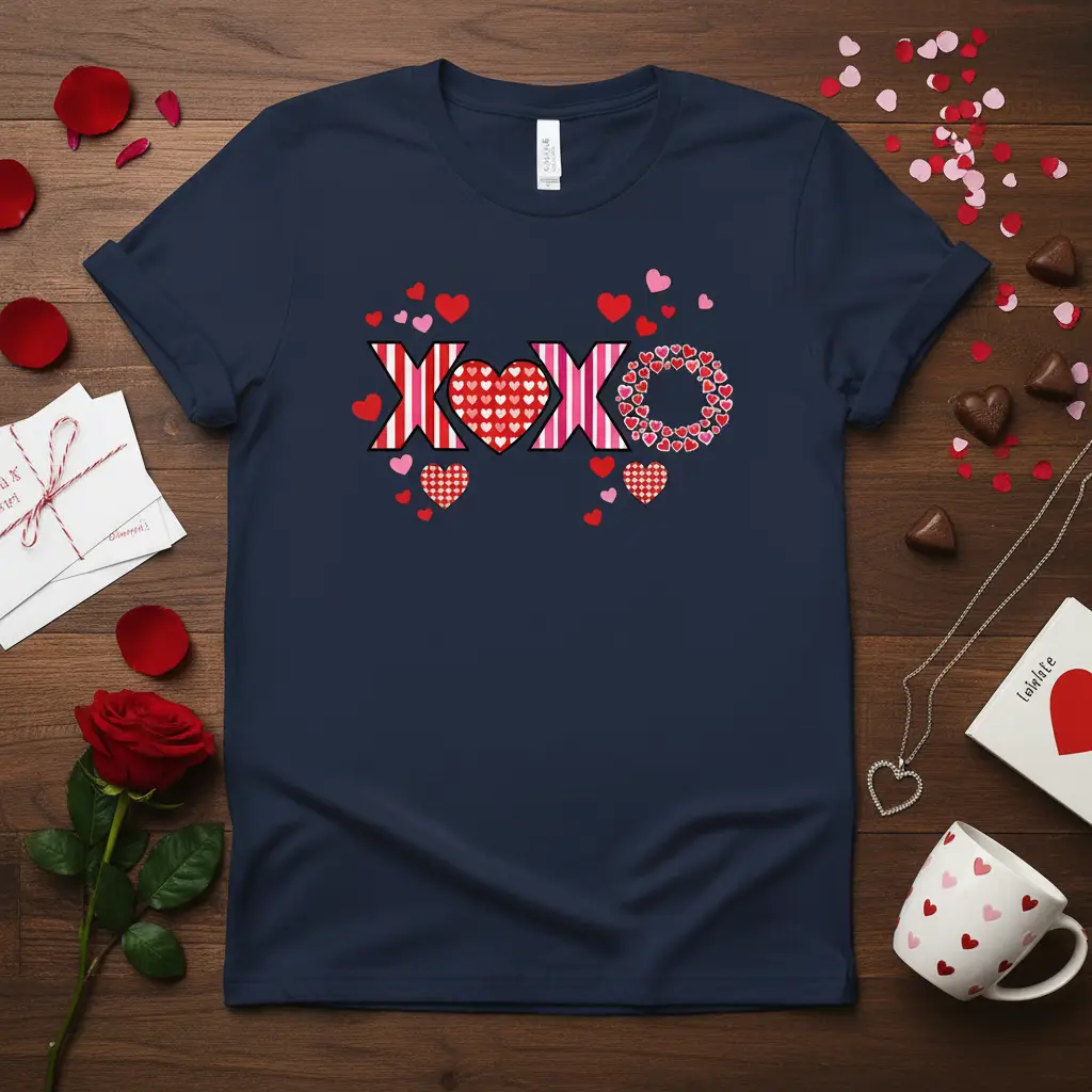 XOXO, the universal symbol of love, hugs, and kisses, is beautifully represented on this festive navy blue t-shirt. This design is more than just apparel; it’s a wearable declaration of affection, perfect for spreading joy and warmth on Valentine’s Day or any day you want to show someone you care. The playful arrangement of hearts and vibrant stripes captures the essence of romance and adds a touch of sweetness to your outfit. It’s an ideal choice for couples looking to coordinate their looks or for anyone wanting to make a charming statement.