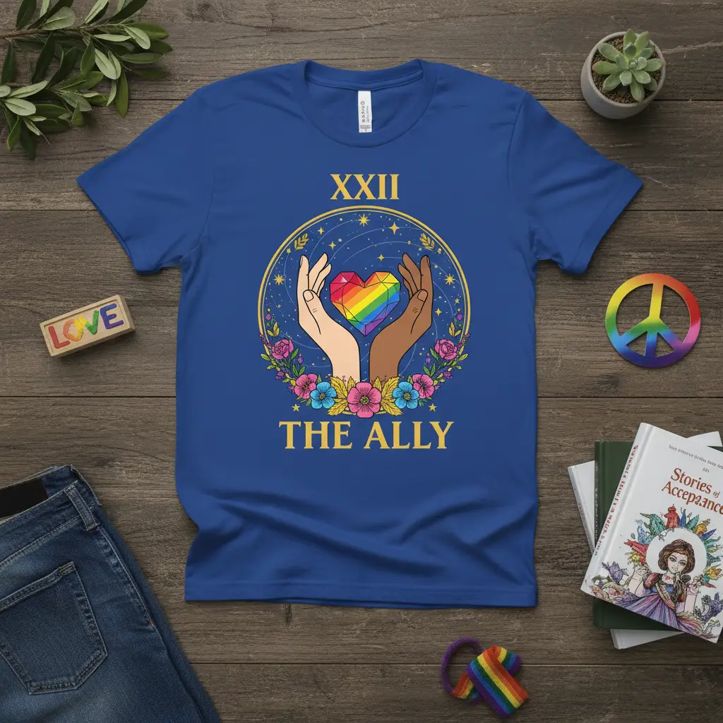 Surrounding this core symbol is a delicate wreath of colorful flowers and shimmering stars, adding an element of hope and universal connection. The Roman numeral “XXII” and the clear declaration “THE ALLY” are prominently displayed, leaving no doubt about the shirt’s message. This XXII THE ALLY design is crafted to resonate with individuals who believe in standing up for what’s right and celebrating the richness that diversity brings to our lives.