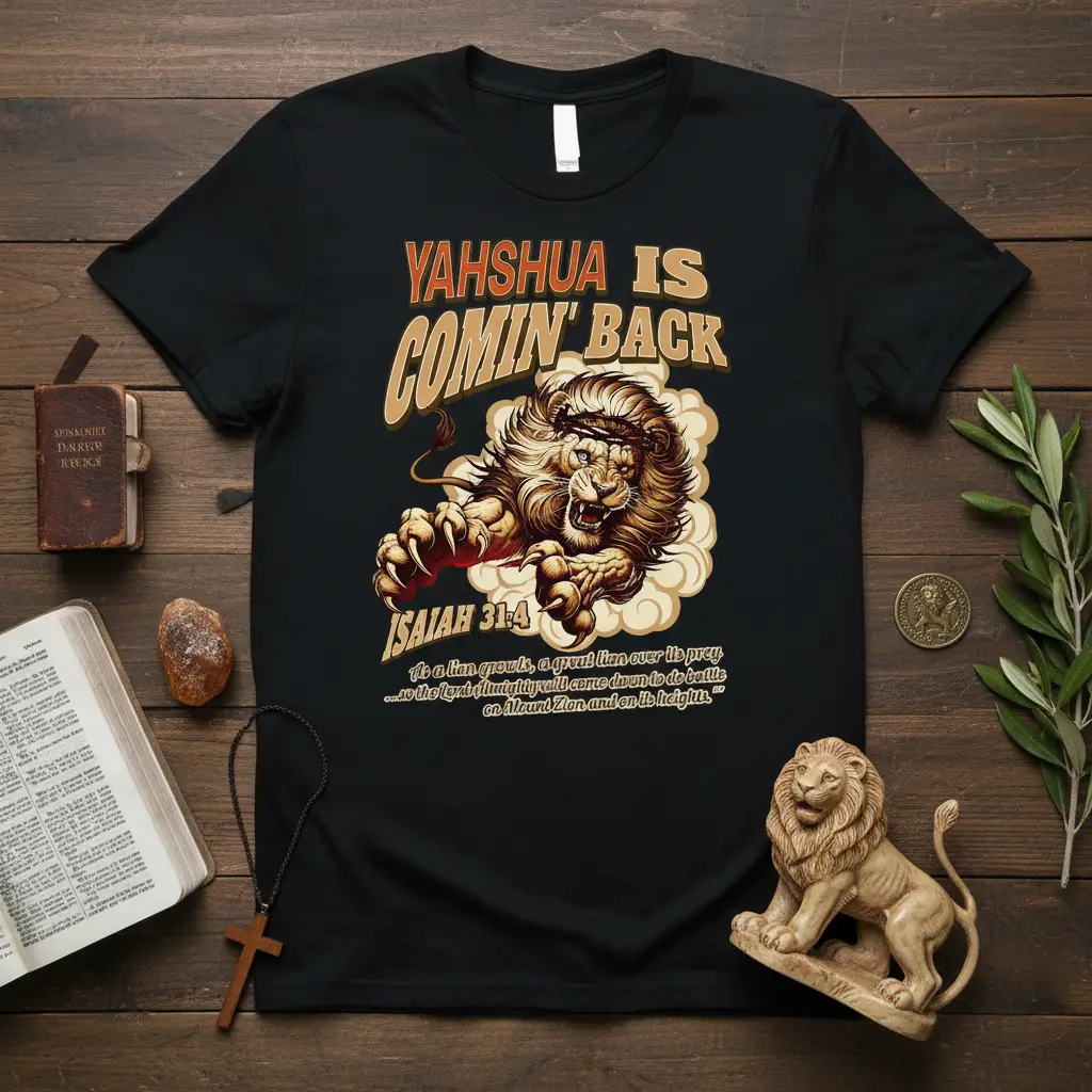 YAHSHUA IS COMIN’ BACK ISAIAH 31:4 “As a lion growls, a great lion over its prey… so the Lord Almighty will come down to do battle on Mount Zion and on its heights.” This powerful t-shirt serves as a bold declaration of faith and anticipation for the Lord’s return. Featuring the majestic Lion of Judah and scripture from Isaiah, it’s designed to inspire and uplift believers. Wear your conviction proudly and share the message of hope with this impactful garment.