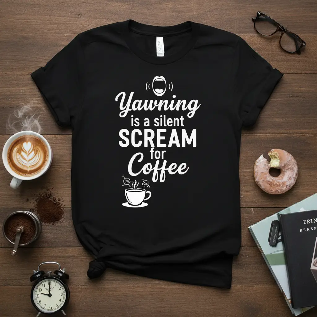 This unique design speaks directly to the soul of every coffee enthusiast. The bold typography ensures the message is clear: sometimes, the loudest expression of need is a silent yawn. It’s a clever and humorous take on the universal experience of needing coffee to function, making it a must-have for your wardrobe.