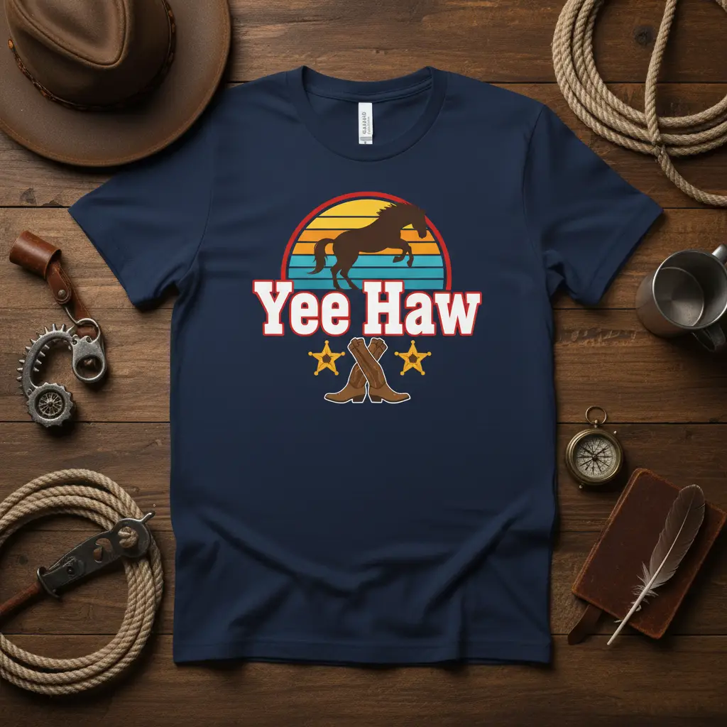This vibrant graphic tee proudly displays the iconic “Yee Haw” slogan, instantly evoking images of dusty trails and open skies. The design features a dynamic silhouette of a horse mid-leap against a colorful retro sunset, accented by classic cowboy boots and sheriff stars. It’s a perfect blend of vintage Western aesthetics and modern comfort, making it an ideal choice for anyone who appreciates cowboy culture and a touch of Americana.
