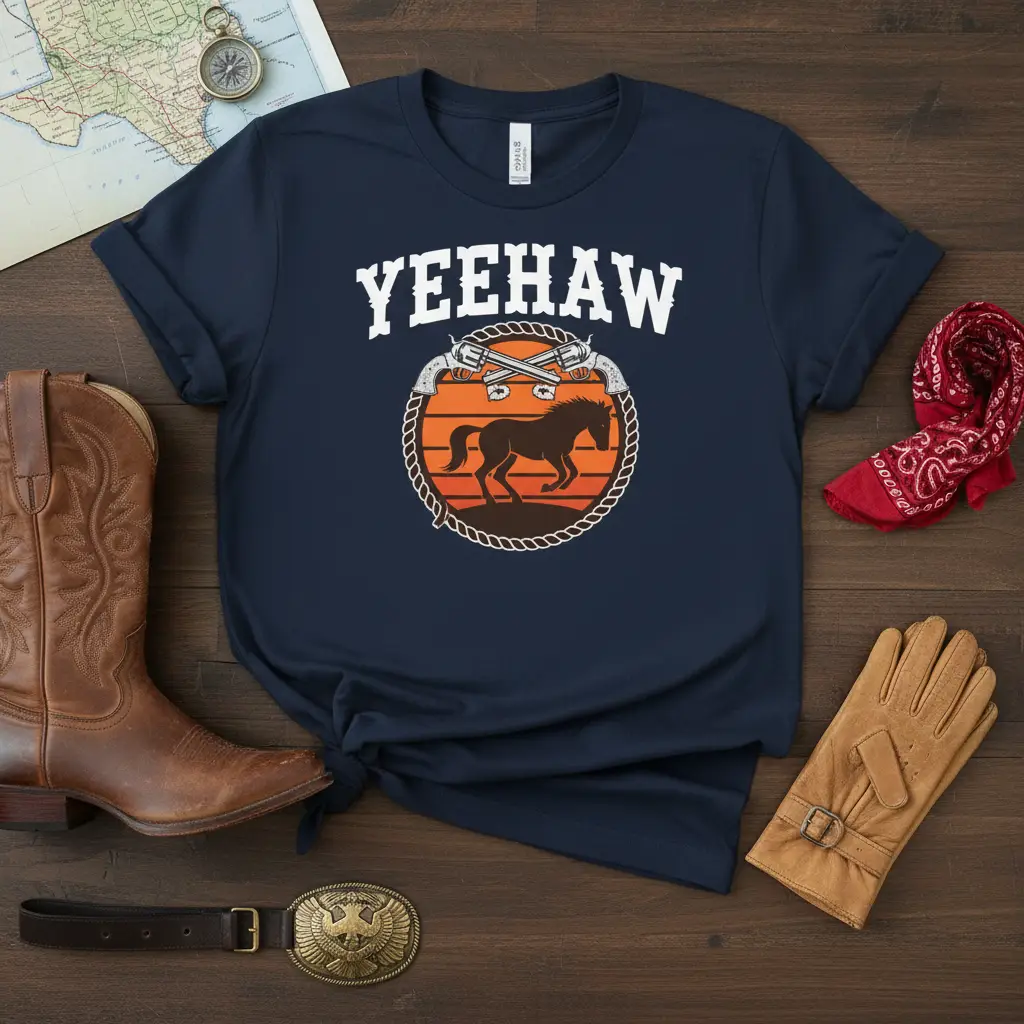 Featuring bold typography and classic western motifs, this “Yeehaw” t-shirt is a true homage to the frontier. The design includes crossed revolvers, symbolizing the daring spirit of the era, alongside a powerful horse silhouette set against a vibrant sunset. This combination creates a visually compelling piece that resonates with anyone who loves western aesthetics. It’s perfect for making a statement and showcasing your appreciation for cowboy heritage.