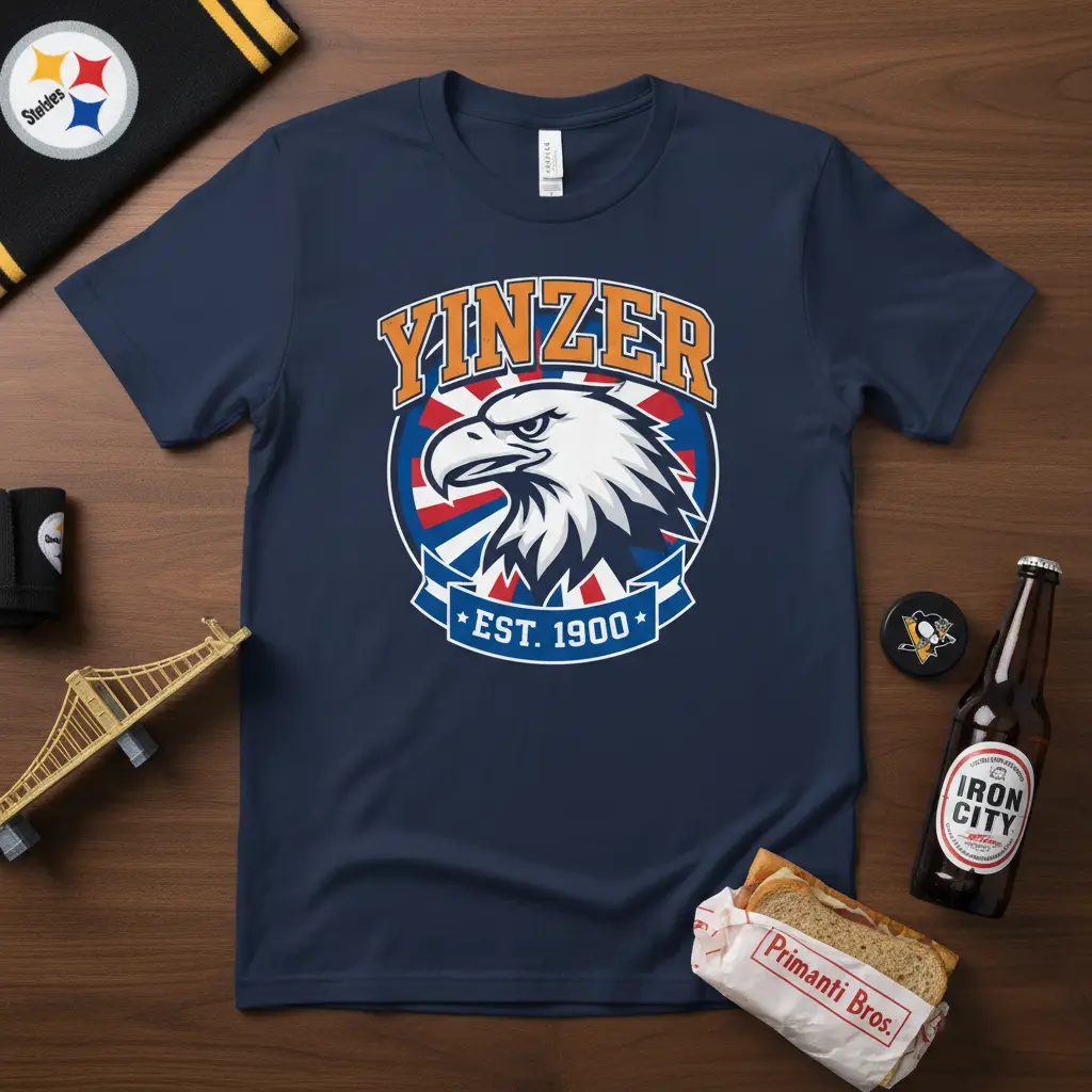 This t-shirt proudly displays “Yinzer Est 1900,” a phrase synonymous with Pittsburgh’s distinct identity and long-standing traditions. The graphic features a bold eagle, symbolizing strength and pride, set against a backdrop that hints at the city’s heritage. It’s a design that speaks volumes without saying too much, capturing the essence of what it means to be from Pittsburgh.