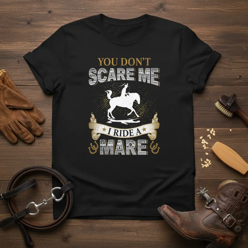 YOU DON’T SCARE ME I RIDE A MARE this statement t-shirt is designed for the fearless equestrian who knows the power and spirit of their mare. It’s more than just apparel; it’s a declaration of passion, confidence, and the unbreakable bond between a rider and their horse. Whether you spend your days in the saddle or dream of it, this shirt speaks volumes about your dedication to the equestrian lifestyle. It’s a perfect way to showcase your pride and assert your position as a capable and courageous rider. This design captures the essence of the equestrian world and is crafted for those who truly understand it.