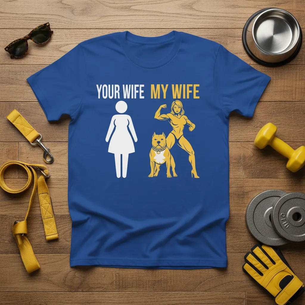 This t-shirt is a fantastic way to express pride in being a fit individual who also happens to be a devoted dog owner, particularly if your furry friend is a pitbull. It taps into the strong community of women who are dedicated to their health and wellness while also being deeply connected to their pets. This YOUR WIFE MY WIFE design is a lighthearted nod to the fact that for some, their “wife” might be a combination of their human partner and their incredibly strong, loving canine. It’s a relatable and humorous concept that resonates deeply within this niche.