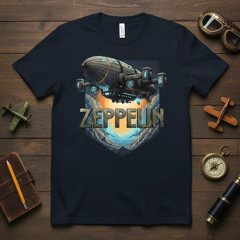 This captivating graphic tee showcases the iconic word “ZEPPELIN” in bold, metallic typography. It is intricately designed to evoke the spirit of adventure and the golden age of air travel. The artwork features a highly detailed steampunk-inspired airship, complete with glowing accents and intricate machinery, as it navigates through a dramatic sky. The surrounding clouds and vibrant sky add depth and atmosphere to the design.
