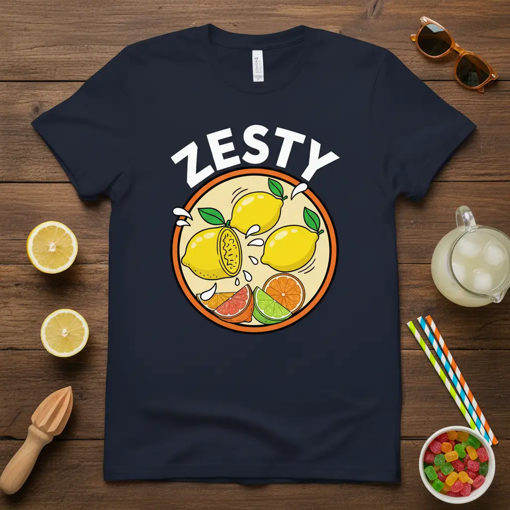 The “ZESTY” text, rendered in a clean, bold font, sits proudly above a circular illustration brimming with citrus goodness. Lemons, both whole and sliced, are the stars, accompanied by juicy wedges of grapefruit and lime, all set against a warm, inviting background. This design is a celebration of fresh flavors and cheerful aesthetics, making it perfect for anyone looking to add a pop of color and fun to their casual wear. It’s an ideal way to express your zest for life and your appreciation for nature’s most refreshing gifts.